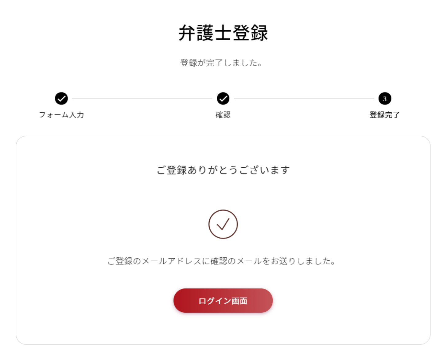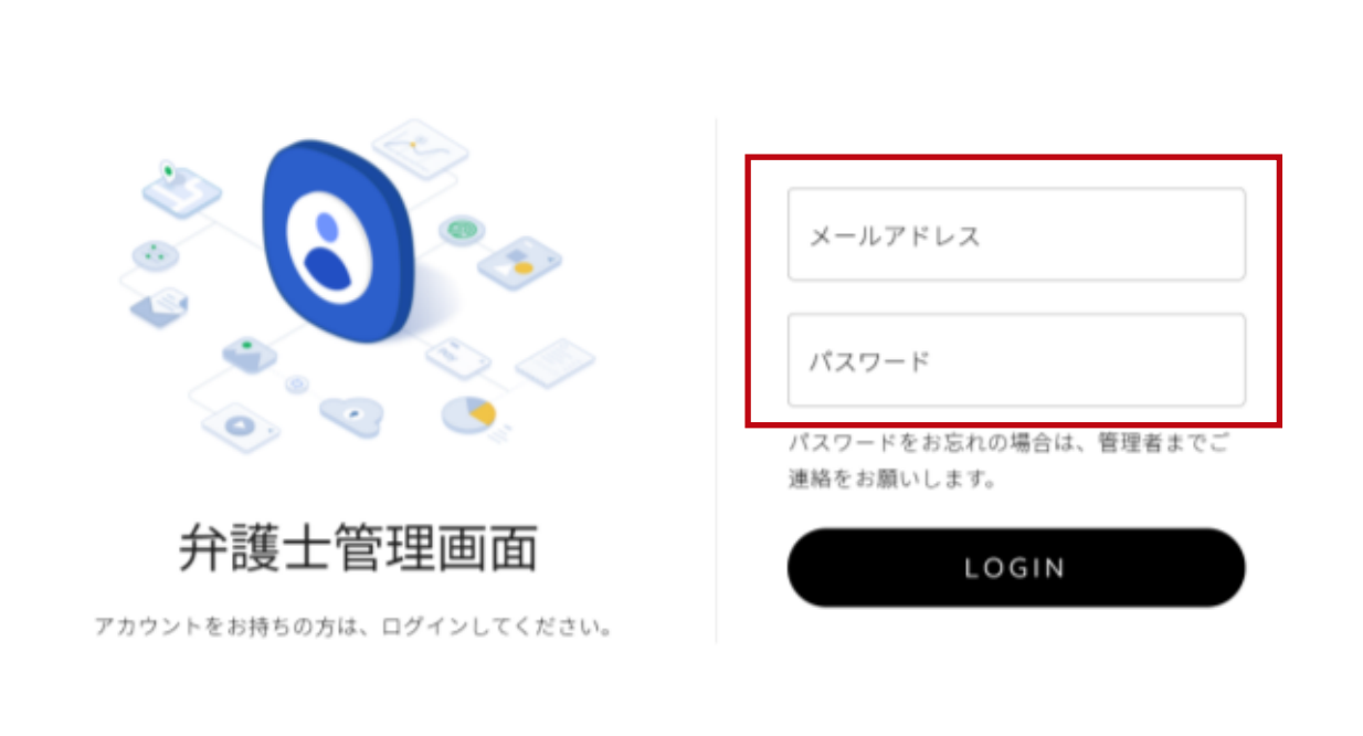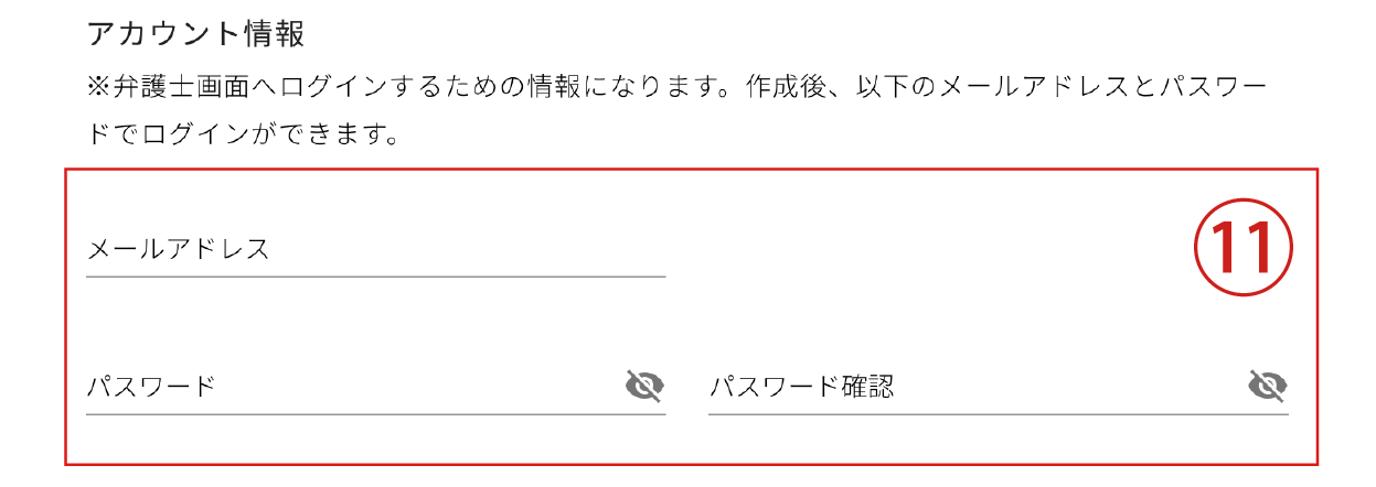本メールアドレスとパスワードは弁護士管理画面(マイページ)のログインの際に必要になりますのでメモを必ず取っておいてくださいませ。