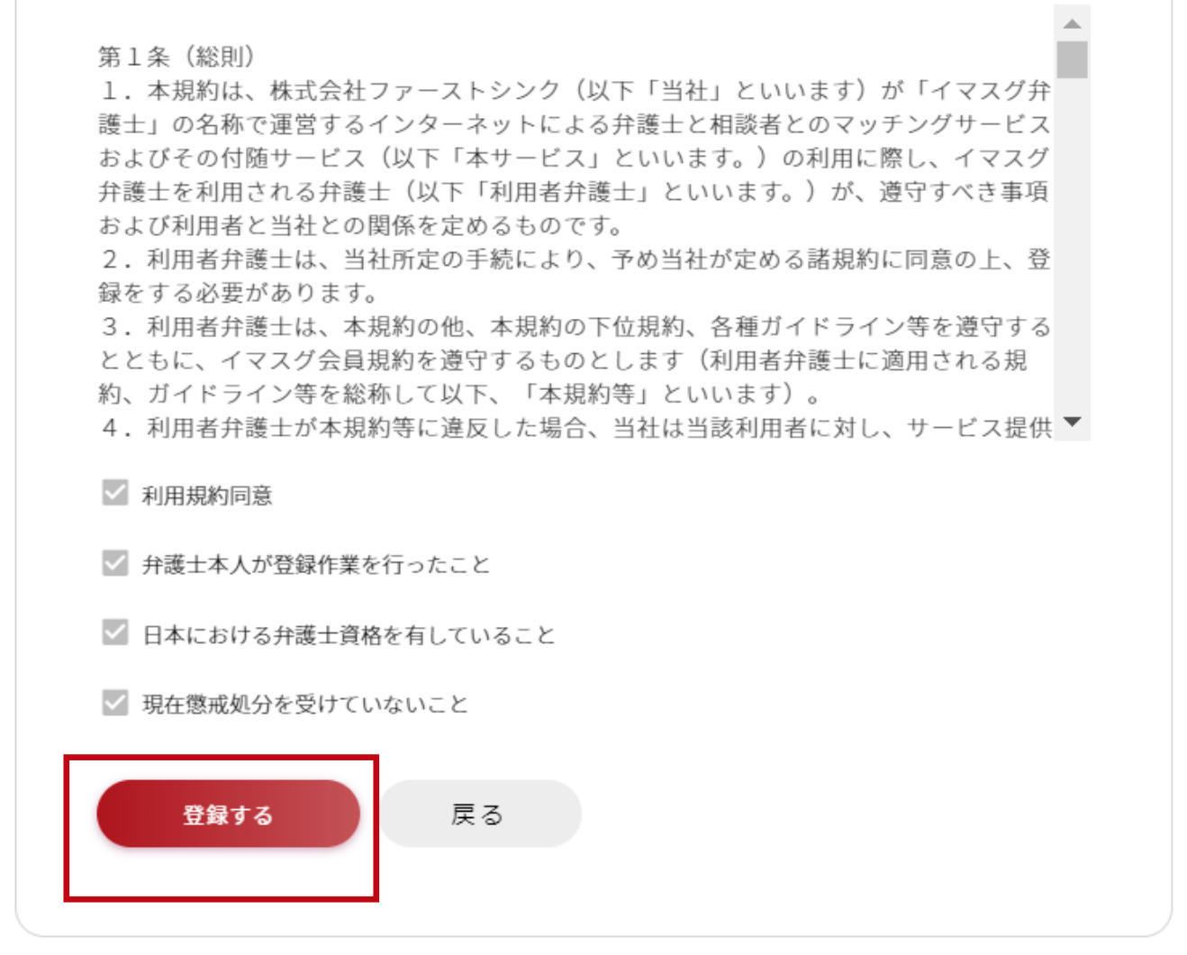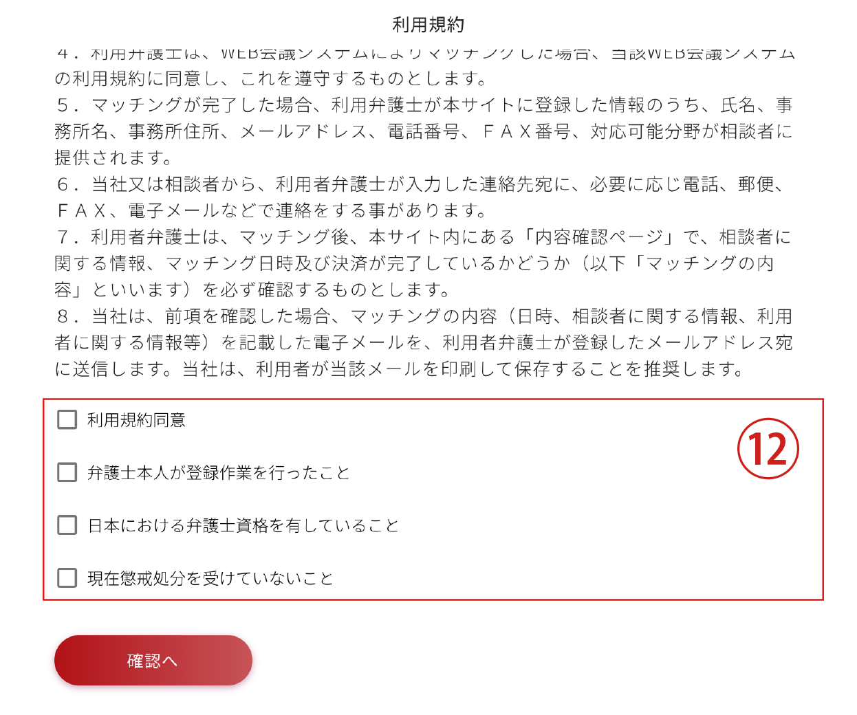 ⑫利用規約の同意及びチェック欄の確認イマスグ弁護士を利用される弁護士様の利用規約をお読みいただき4項目すべてにチェックをいただき「確認へ」ボタンを押してください。