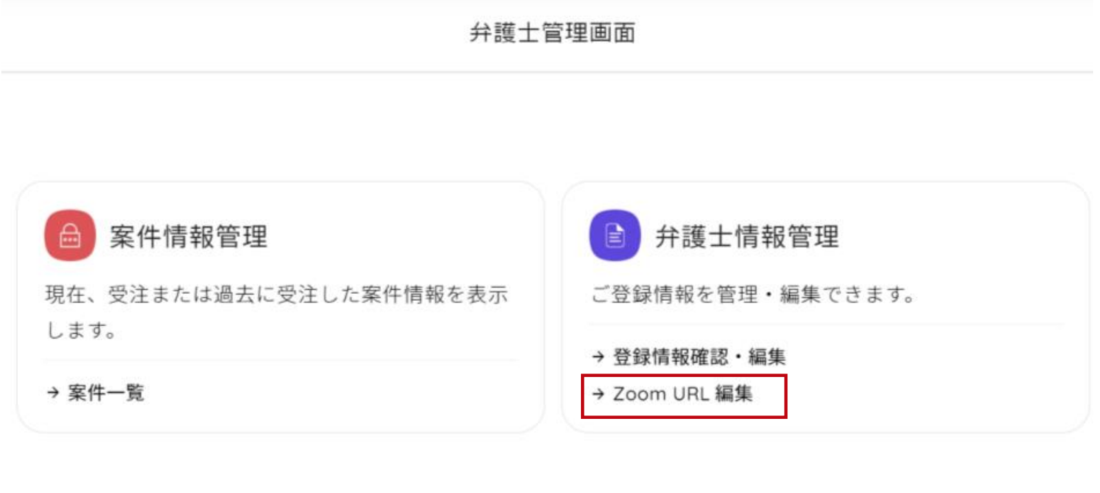 ①管理画面より「弁護士情報管理」の「ZOOM URL 編集」をクリックします。